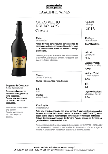 Nous aimons faire différentes choses et l’irrévérence de la vieille bouteille d’Ouro Velho en est une illustration. Un vin différent doté de personnalité mérite une bouteille unique dans le monde entier. The Old Gold est le meilleur accompagnement de belles situations de la vie comme une fête ou un mariage.